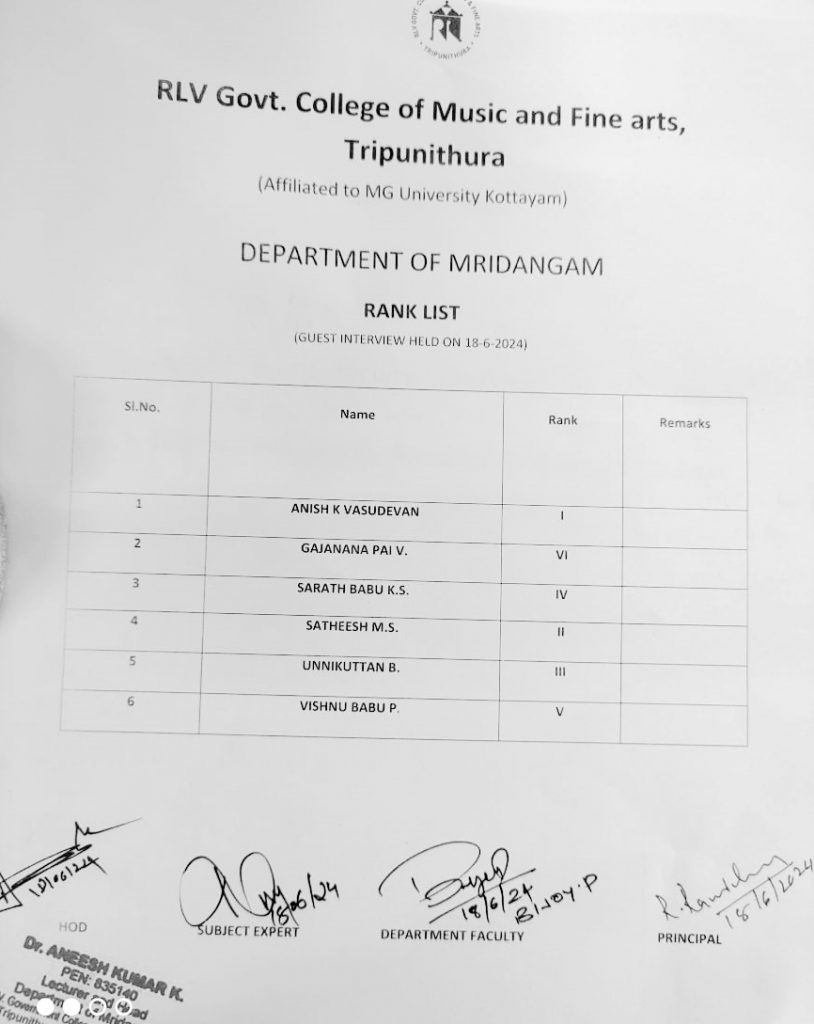 മൃദംഗം വിഭാഗം അഥിതി അധ്യാപക – ഇന്റർവ്യൂ റാങ്ക് ലിസ്റ്റ് മൃദംഗം വിഭാഗം അഥിതി അധ്യാപക – ഇന്റർവ്യൂ റാങ്ക് ലിസ്റ്റ്