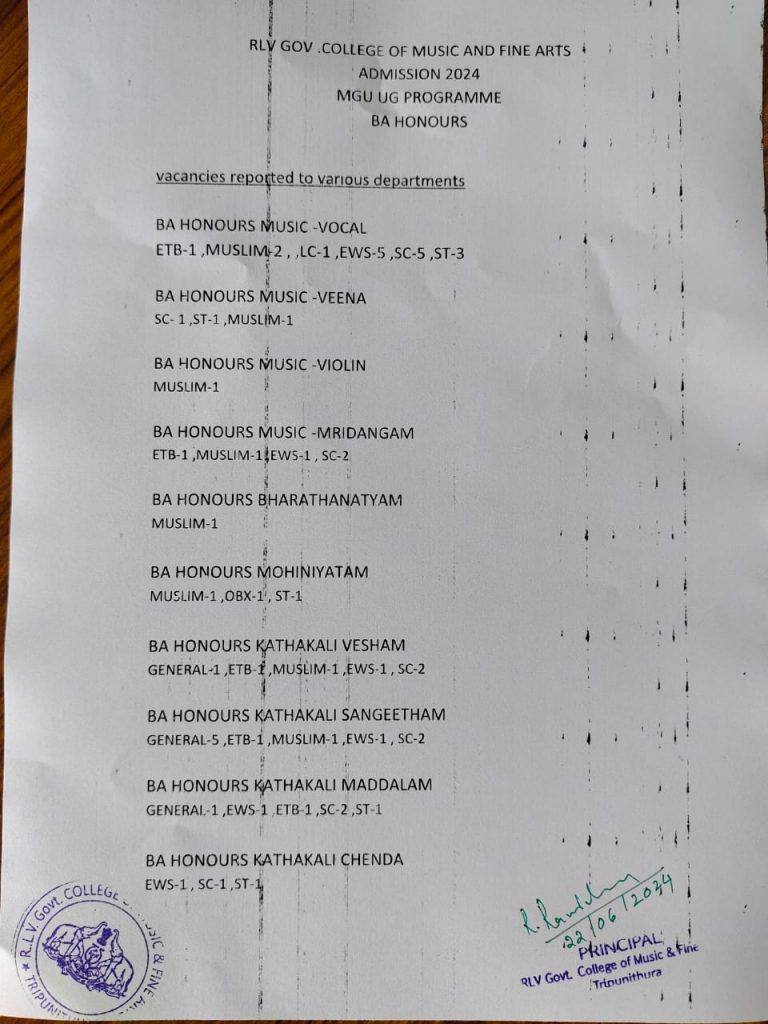 ആർ. എൽ.വി. ഗവ. കോളേജ് ഓഫ് മ്യൂസിക് ആൻഡ് ഫൈൻ ആർട്സ് – വിവിധ BA Honours കോഴ്സുകളിൽ ഒഴിവുള്ള സീറ്റുകളിലേക്ക്അപേക്ഷ ക്ഷണിച്ചു. Music- വോക്കൽ, വീണ, വയലിൻ, മൃദംഗം, ഭരതനാട്യം, മോഹിനിയാട്ടം, കഥകളി വേഷം, കഥകളി സംഗീതം, കഥകളി ചെണ്ട, കഥകളി മദ്ദളം എന്നീ വിഭാഗങ്ങളിലാണ് ഒഴിവുകൾ ഉള്ളത്. 24.06 24 മുതൽ 25.06.24 വരെ കോളേജ് ഓഫീസിൽ നിന്നും അപേക്ഷ ഫോമുകൾ ലഭിക്കുന്നതാണ്.