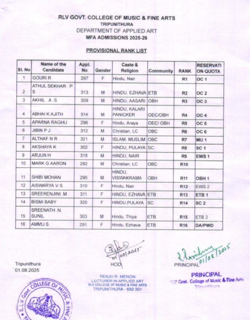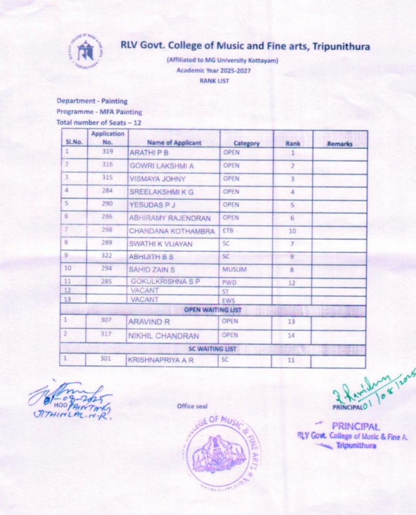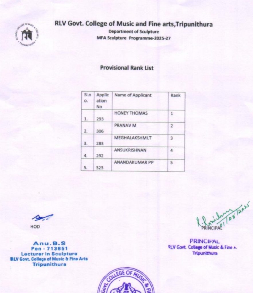 Provisional Rank List 2025-27 MFA Applied Art , Sculpture & Painting