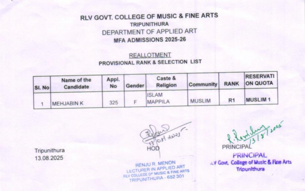 Provisional MFA Rank List and Selection List Applied Arts 2025